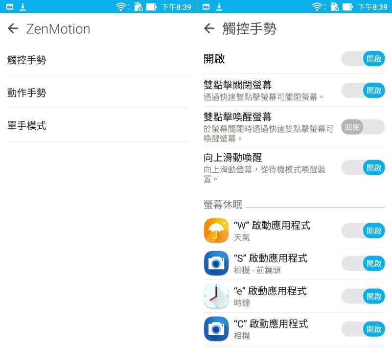 內建的 ZenMotion 有各種手勢可以使用,像是觸控手勢,可以在休眠的狀態下,直接在螢幕畫文字來啟動對應的功能。