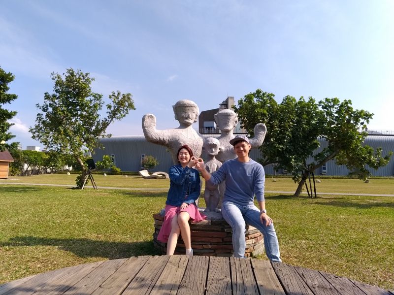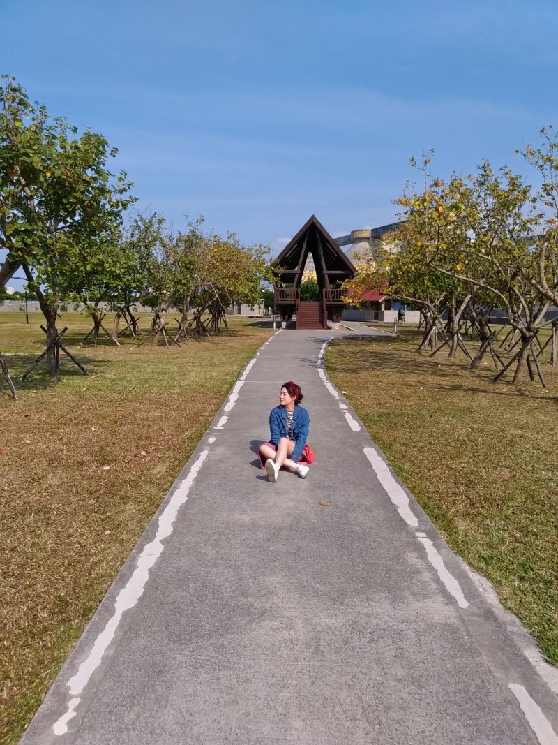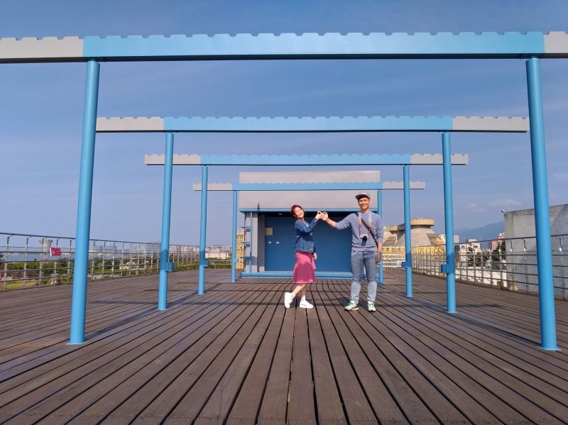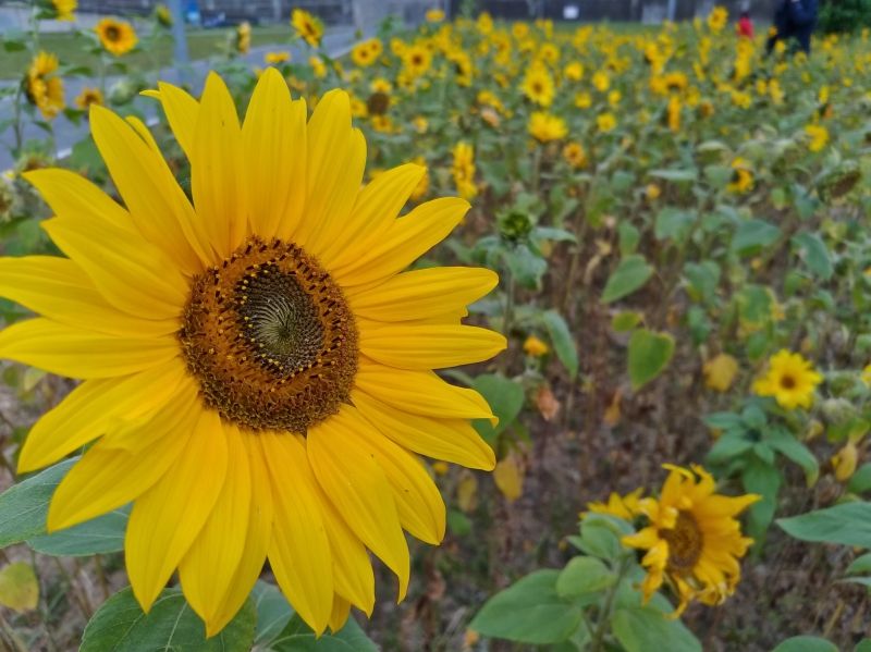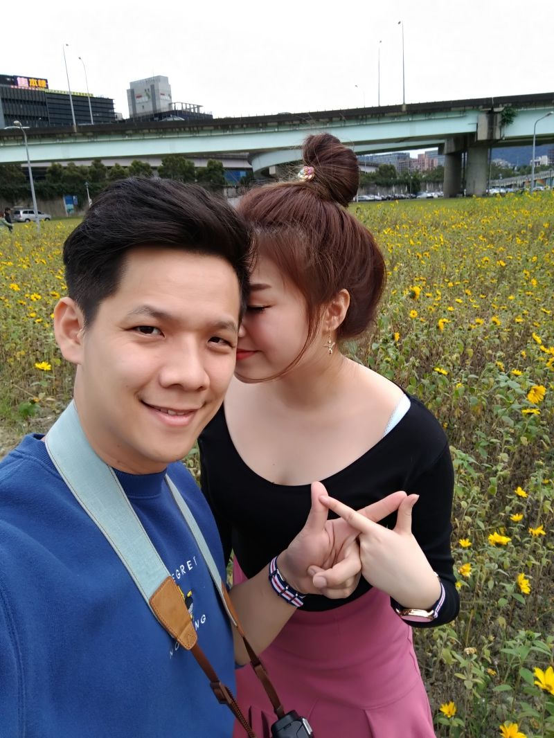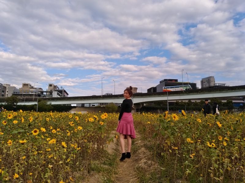 沒想到在市區裡也有向日葵田可以拍攝,這個是在松山彩虹河濱公園,面積還不算小,這張是使用前鏡頭美顏模式下拍攝,只有使用美膚等級 5,效果還蠻自然的,光我的黑眼圈就去掉了一大半啊!