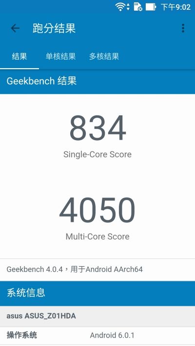 透過 Geekbench 4 測試,單核分數為 834,多核為 4050。