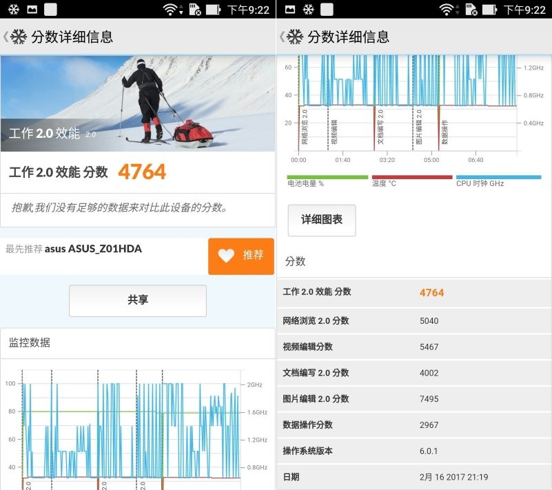在安兔兔的測試下,獲得 62765 分,以效能來說就是定位在中階手機,不過要注意的是高通 S625 這顆處理器搭載 FinFET LPP (Low Power Plus) 省電技術,因此在續航的部份是很驚人的(後面有 PCMark 的續航測試結果)。