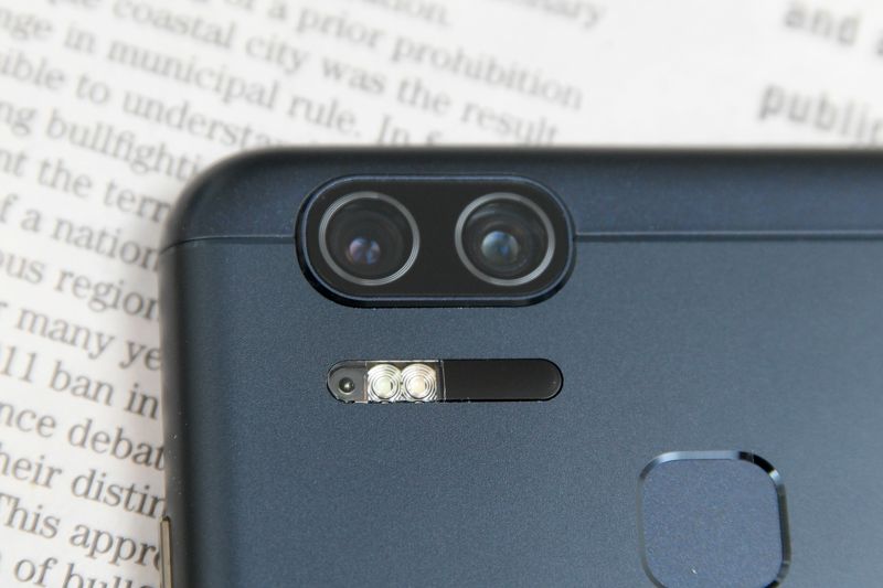 雙鏡頭的部份,左邊的是主鏡頭,搭配 1200 萬像素、f/1.7 大光圈/25mm焦段/感光像素尺寸 1.4um 的廣角鏡頭、支援光學防手震及電子防手震,並搭載 ASUS SuperPixel™ 技術,有著更強的感光度,讓照片更加明亮(特別是低光源、逆光下更能看出差異);右邊為焦段 59mm 的輔助鏡頭,搭配 2.3 倍光學定焦鏡頭、1200 萬像素的相機,最大支援到 12 倍數位變焦。