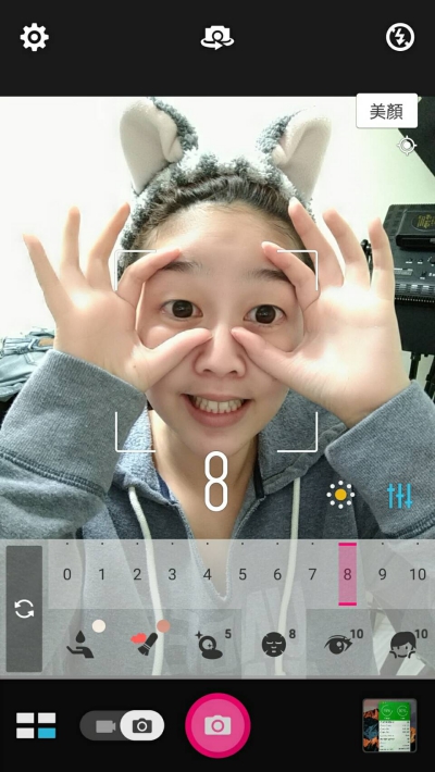 切換成前方自拍鏡頭時,預設就是使用美顏模式拍攝,可以調整的除了膚質之外,還能大眼小臉,就算沒上妝也能幫你紅潤臉頰,隨時自拍都有好氣色。