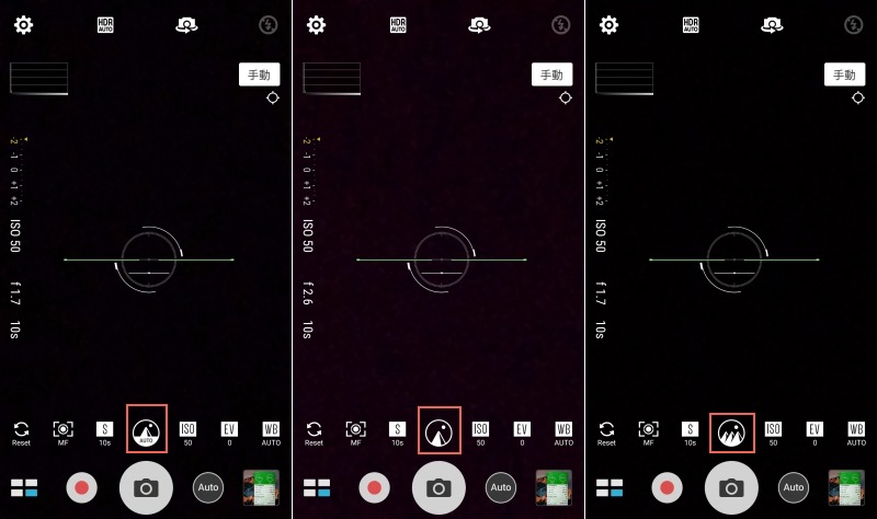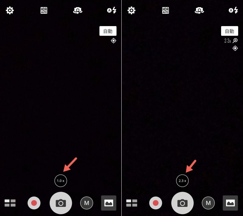 在手動模式下按中間紅框處圖示可以切換使用的鏡頭,下圖左出現 auto 字樣表示會自動選擇,中間的一座山是切換為 2.3 倍光學變焦,右圖的三座山圖示代表使用廣角鏡,可以依需求來指定使用哪一顆鏡頭。