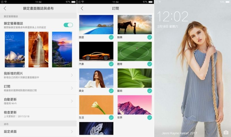 在鎖定畫面預設是開啟顯示雜誌的照片,可以依自己的喜好選擇分類,每次喚醒手機時,鎖定畫面都有不同的雜誌照片可以看。