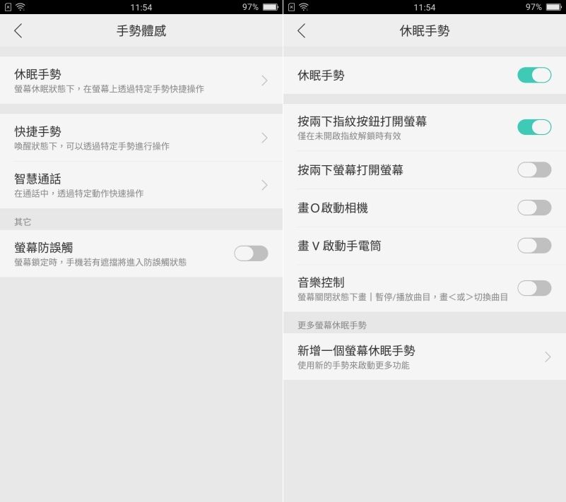 內建也有各種手勢可以使用,像是在休眠狀態下,預設可以按二下指紋喚醒螢幕,也可以設定按二下螢幕喚醒,除了內建的這些手勢之外,也能自定新增手勢指定常用的應用程式等。