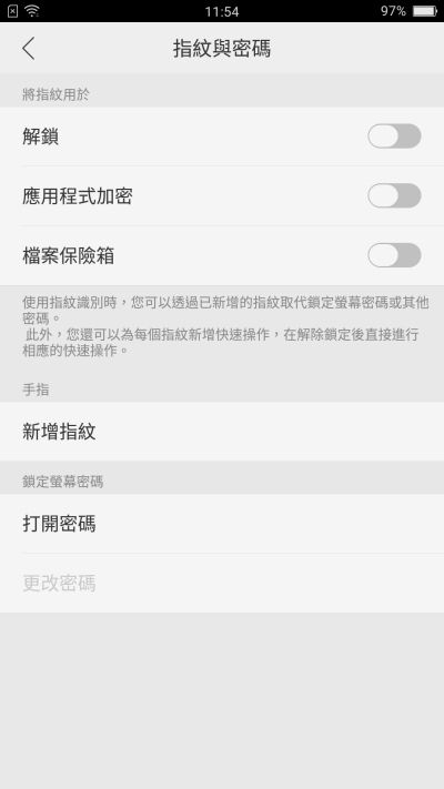 指紋功能除了用於解鎖之外,還能用在應用程式加密以及檔案保險箱功能,最多可加入五組指紋,你也能針對不同指紋指定不同的應用程式,當你使用指紋解鎖手機時,就會依據你設定的指紋直接進入指定的應用程式。