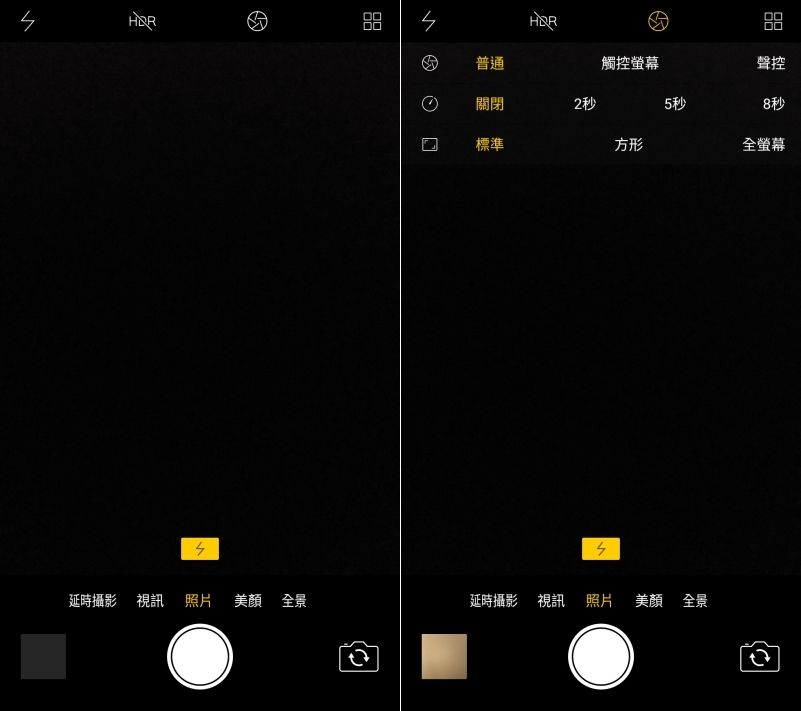 基本的相機功能包括延時攝影、錄影(視訊)、美顏以及全景,快門除了按鍵之外可依使用習慣選擇觸控快門或是聲控,定時拍照包括 2 秒、5 秒、8 秒;在拍照時也能選擇使用標準畫面(4:3)、方形(1:1)或是全螢幕(16:9)。