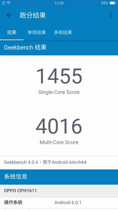 Geekbench 4 在單核心處理器的部份獲得 1455、多核則是 4016。