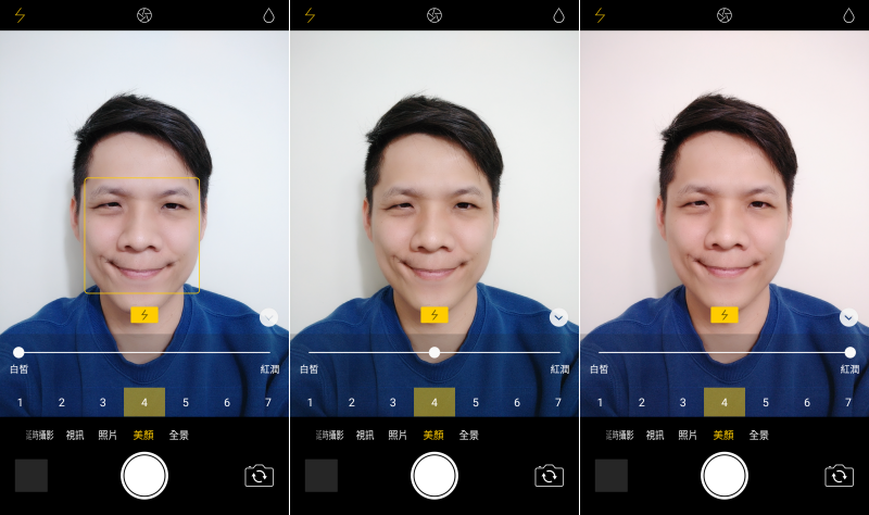 在美顏 4.0 模式下,有七段等級調整之外,也能針對喜好讓皮膚看起來白皙一點或是紅潤一點,從下圖就能看出左中右的調整剛好呈現出不同的膚色。
