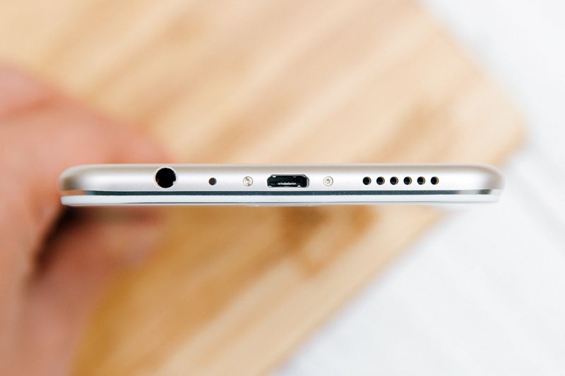 底部為 3.5mm 耳麥孔、降噪麥克風、microUSB 傳輸/充電埠以及喇叭輸出孔。