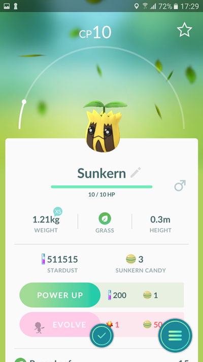 第一隻二代寶可夢抓到了,是草系的叫做 Sunkern(向日種子),好可愛啊!而且右下角多了性別,是男生。