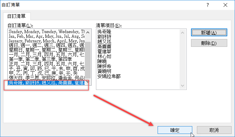 左邊的一大排清單,預設有星期幾、月份、甲乙丙丁等等,看看有沒有你要用的,如果沒有就自訂新清單吧,在清單項目這裡打上你要排序的內容,每打一個就按 Enter 再打下一個,全部打完按「新增」。