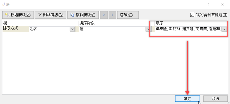 再對一下你選擇的排序清單,OK 就按確定。