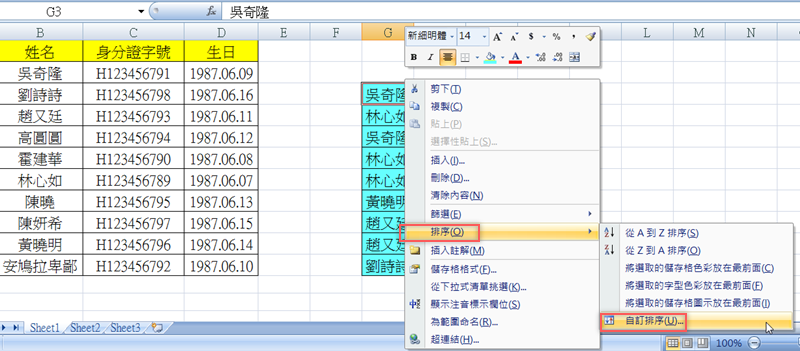 再做個實驗,假設我們的資料只有清單上的幾個人名,還有幾個是重複的,一樣按右鍵,選自訂排序。