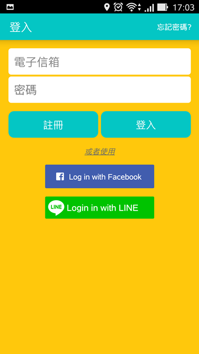 下載後開啟會要求註冊帳號,或用 Line、FB 登入。