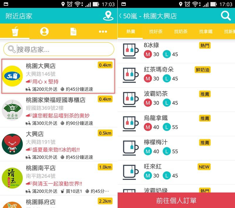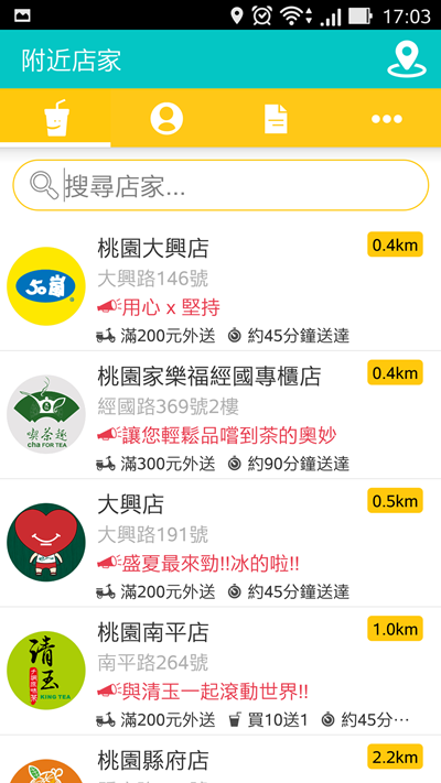 登入後會立刻定位,馬上可以知道附近有哪些飲料店,還會顯示距離、外送條件、花多少時間可以送達,也可以先訂好最後選自取,就不用等了。