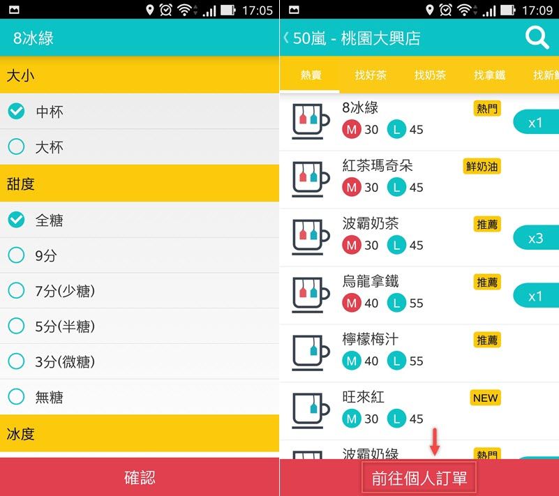 還可以選擇大小杯、甜度冰塊、冷的熱的、加什麼料,就像面對面定飲料一樣完全客製化,點完確認再前往個人訂單。