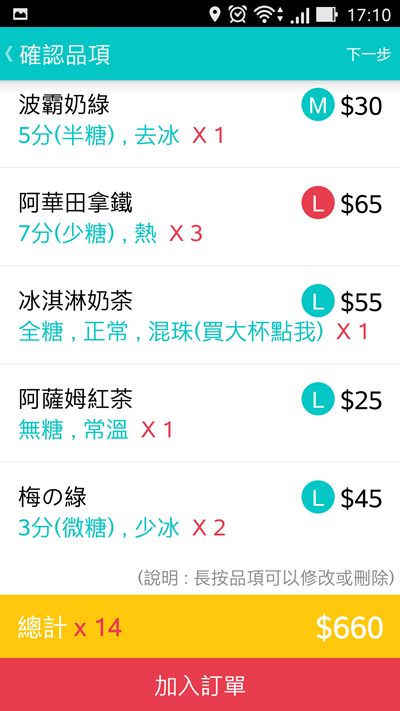 點了那些飲料、共幾杯、多少錢一目瞭然,確認後加入訂單。