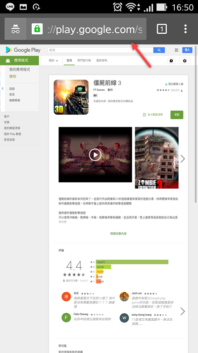 在手機用瀏覽器開啟 Google Paly,網頁記得改成用電腦版瀏覽,選擇要下載的應用程式頁面。