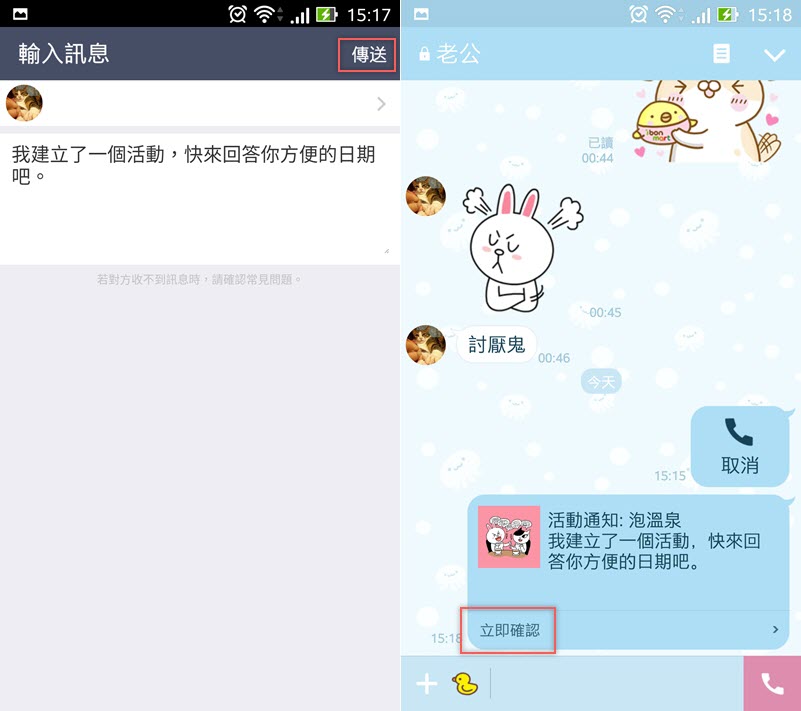 這裡會發現,如果你是在一對一的聊天頁面建立活動,就只能邀請跟你聊天的人?別擔心,後面有地方可以邀請其他人,傳送出去之後,朋友會在聊天室收到活動通知,請他點「立即確認」。