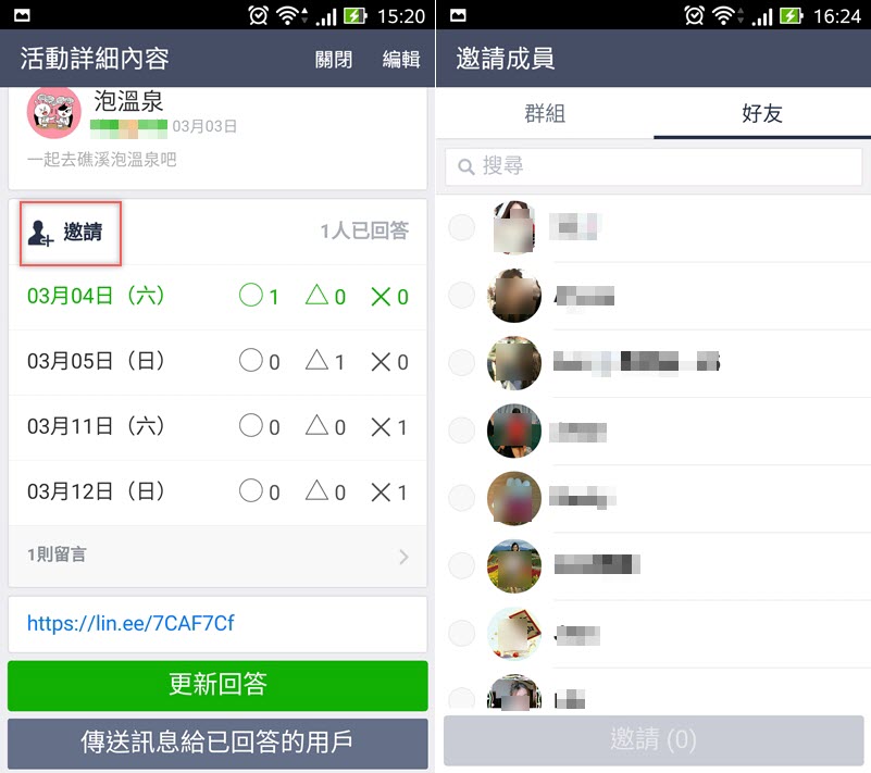 在詳細內容這邊會清楚看到大家回答的狀況,也可以編輯活動,最重要的是剛剛提到的「邀請成員」,點+就可以邀請其他人囉,群組或是單一朋友都可以選。