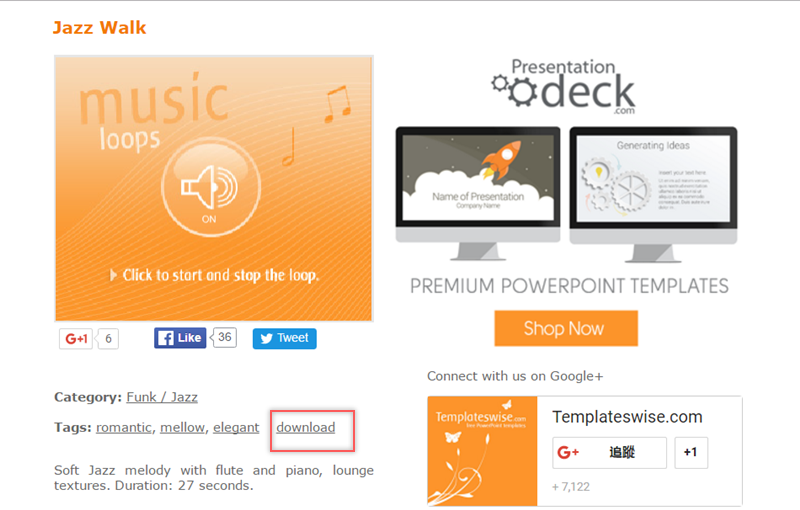 除了必備的 PPT 模板和圖表,比較特別的是這個網站還有背景音樂可以下載。