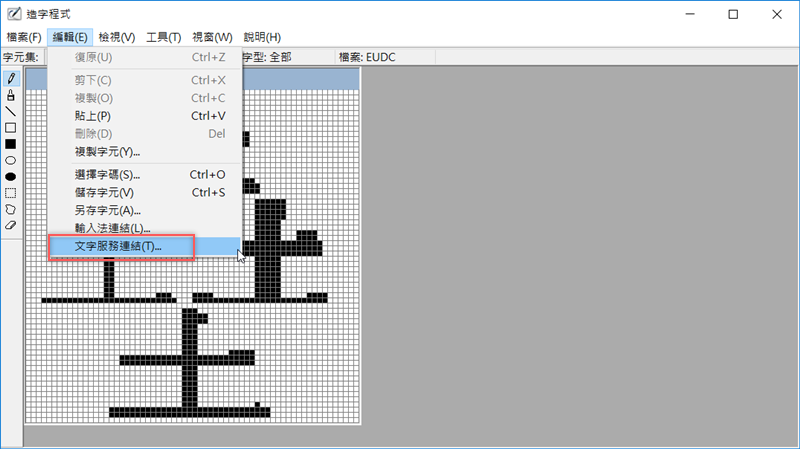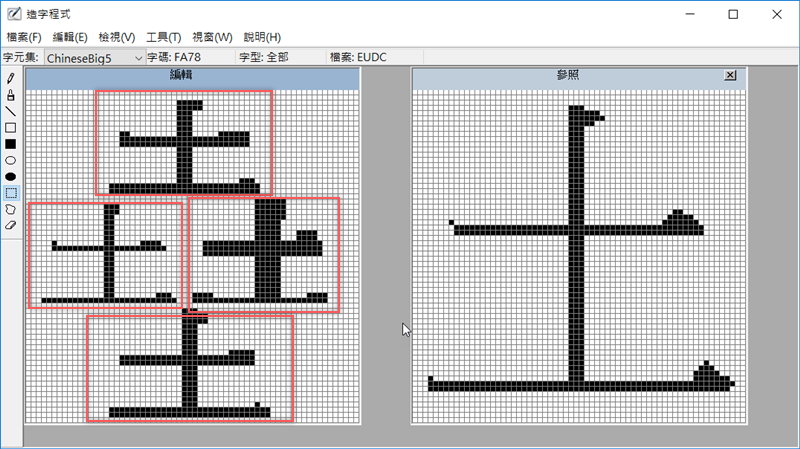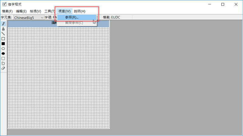 進到造字頁面,其實你可以用左邊那一排工具列上面的筆型符號,用寫的寫出來,但你試過就知道很容易歪掉,我們還是用阿湯之前介紹的方式來做比較好,到上排視窗點「參照」。