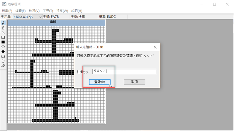Windows 7 內建的造字程式,其實 Windows 10 內部也有,只要自己建立這些字並與輸入法連結,就算是根本不存在的字也可以自訂一個輸入法。