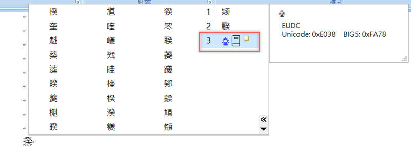 最後就來試試看成不成功吧,到 Word 打「ㄎㄨㄟˊ」,造的字會出現在最後一個。