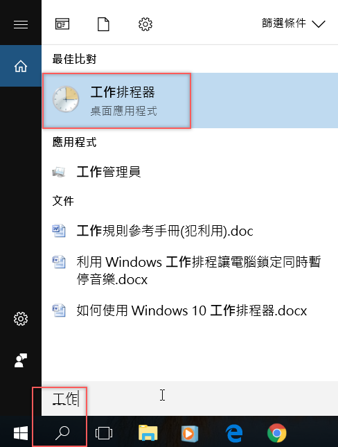 到螢幕左下角放大鏡,輸入「工作」搜尋,第一項就是工作排程器,點擊進入。