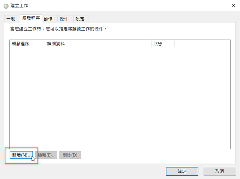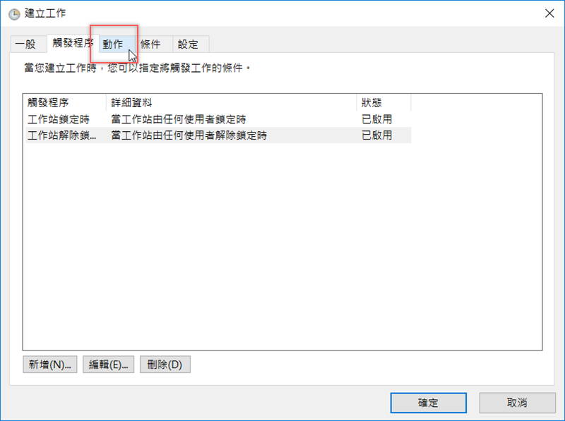 因為這個工作是關於電腦鎖定前後的動作,所以我們要再新增一個觸發程序。