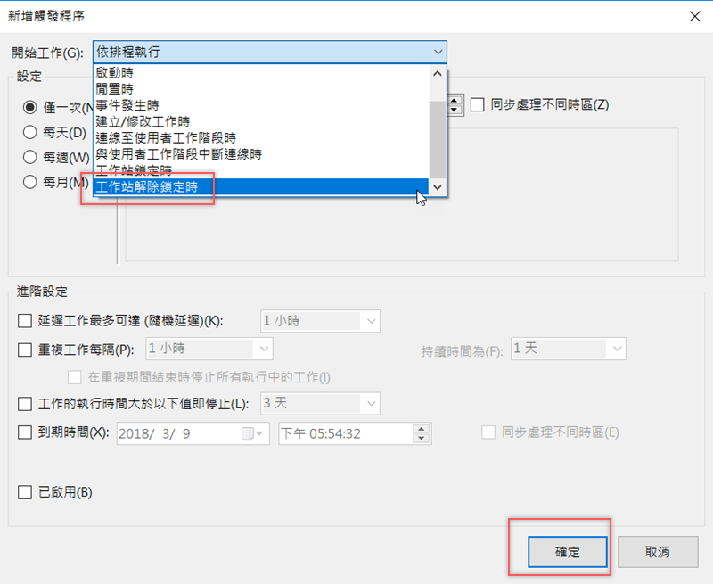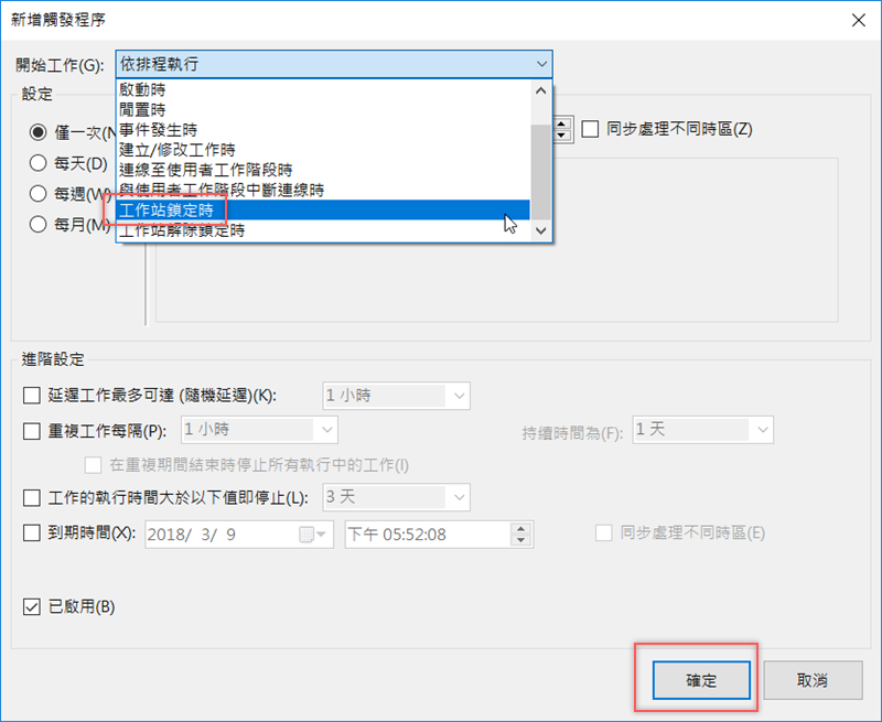 在最上面「開始工作」選單往下滑到「工作站鎖定時」,如果沒有要另外設定執行時間,就直接點「確定」。