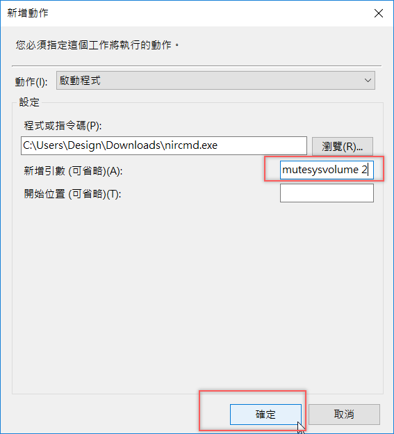 最後在新增引數的地方輸入「mutesysvolume 2」後確定就完成了。
