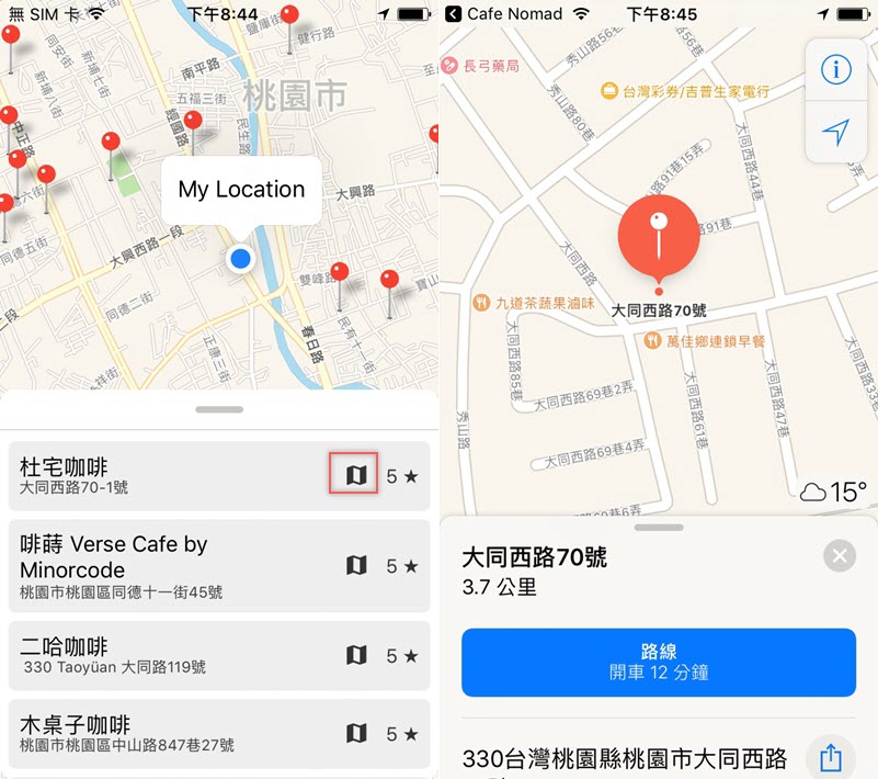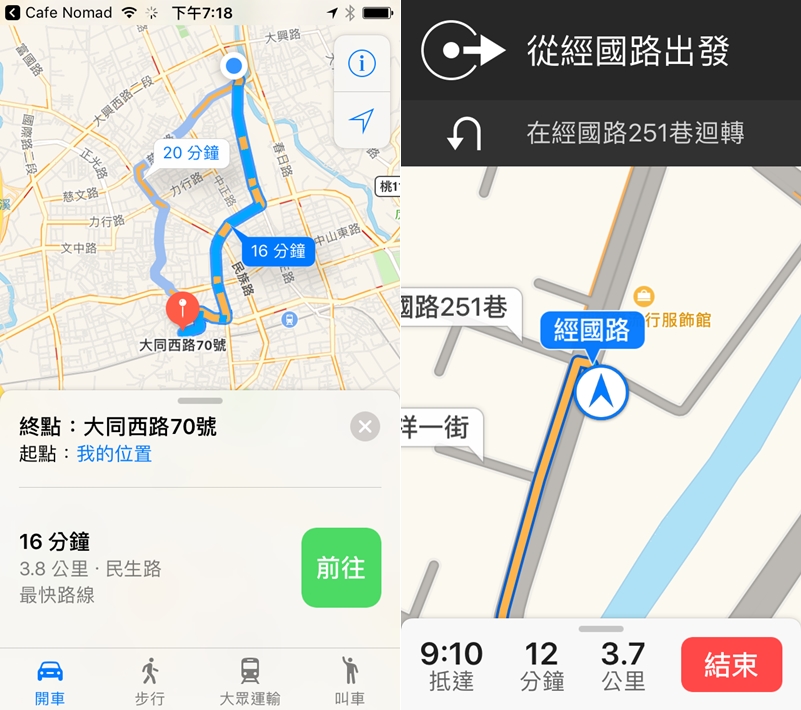 點擊名稱右邊的圖示可以開啟導航,開啟後會在地圖下方顯示開車要花的距離與時間,也可以切換交通工具。