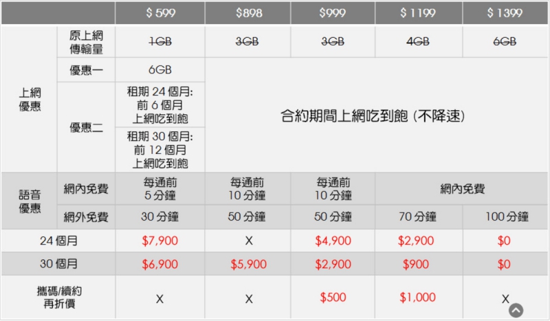 如果搭配最低的 4G 資費 599 元,用 2 年約期來算,手機價格也才 7,900 元,而且還有前 6 個月吃到飽,之後則每個月還有 6GB 可以使用,真的需要網路吃到飽,那麼就可以考慮 898~1,399 之間的方案,都是相當划算的。