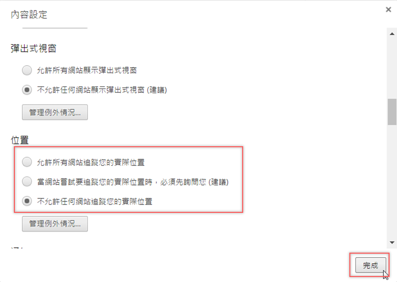 在大概是中間的地方找到位置,包含三個項目,預設是中間的「當網站嘗試要追蹤您的實際位置時,必須先詢問您」,就是會冒出定位要求,把它改成下面的「不允許任何網站追蹤您的實際位置」或是第一項「允許任何網站追蹤您的實際位置」都不會再提示,差別在於第一項是直接開綠燈讓有需要的網站知道你在哪裡不用問,第三項是不讓任何網站取得位置資訊,選好就點完成。