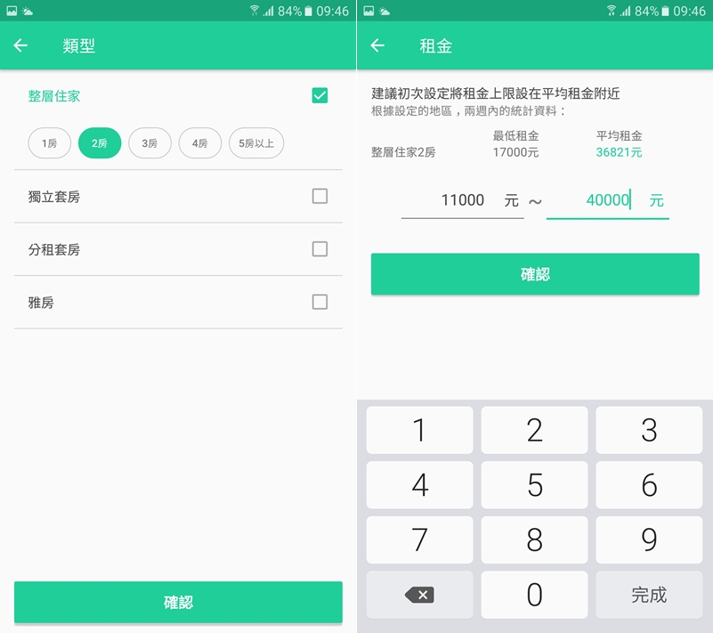接著設定類型和租金,有整層住家、獨立套房、分租套房或雅房可選擇,阿湯選了整層住家中的 2 房(也是可以複選),租金的部分就參考資料庫的平均租金輸入範圍。