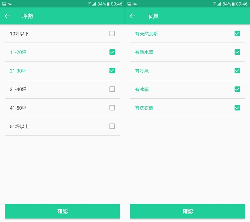 坪數範圍也蠻廣的,10 坪以下到 51 坪以上都可點選,一般兩房大概 2、30 坪差不多,家具部分當然是全部都有附最方便。