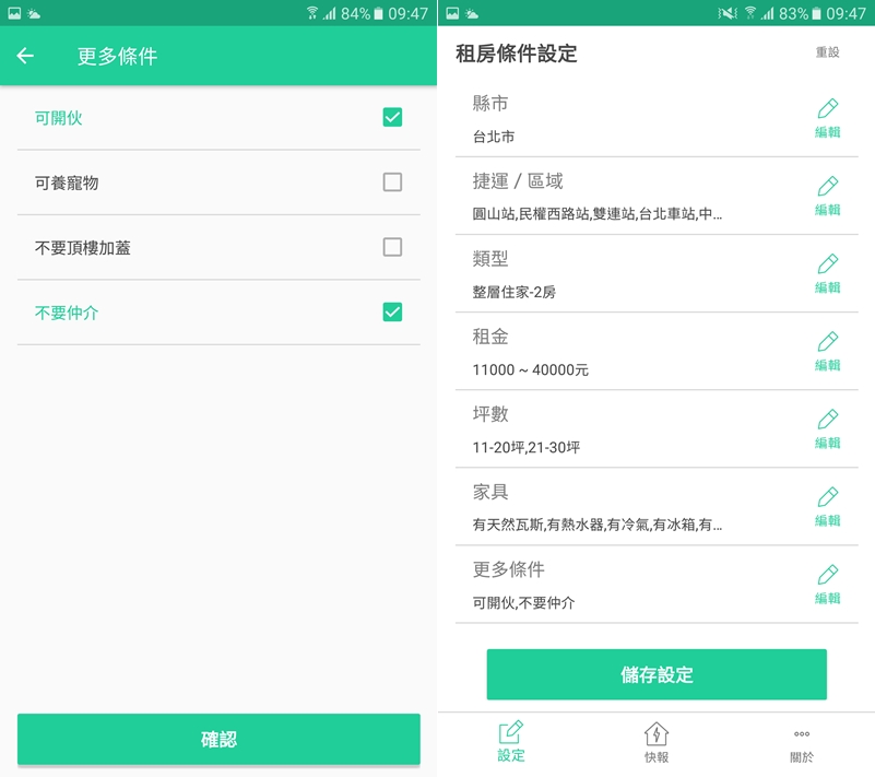 更多條件的部分只有四項可以點選,有煮東西的需求就點可開伙,然後通常會自己上網找的都不會想要仲介干涉吧,最後再確認一下條件就可以儲存了。