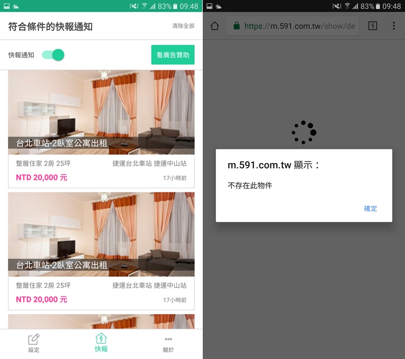 到快報通知去看是兩筆相同的物件,再點進去卻顯示不存在了。