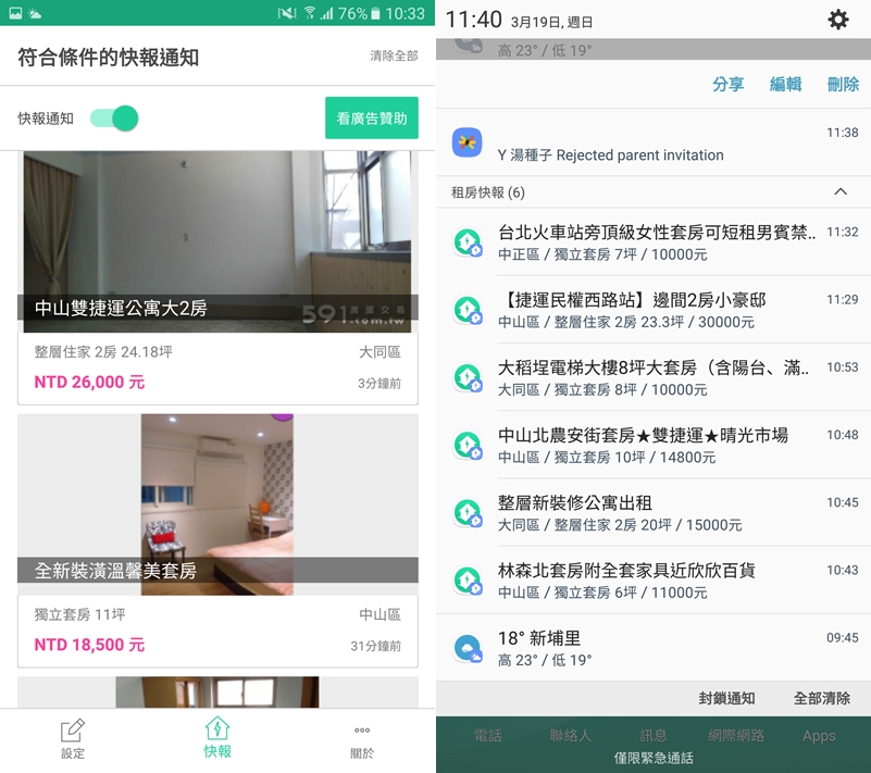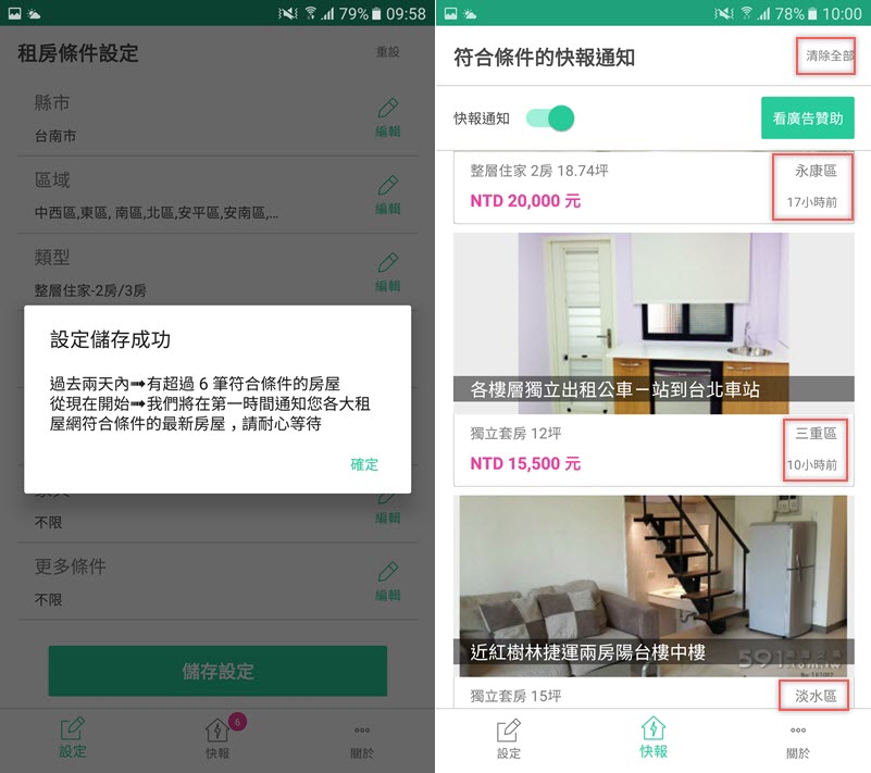 試試看快報功能,條件設定完畢後,左上角快報通知不要關掉,手機丟在一旁隔一段時間就有訊息聲,不到一個小時共顯示有 6 筆資訊,跟網站同步更新,但是阿湯找了台北、新北、台南、花蓮的房子都只有看到 591 租屋網的資訊,跟 APP 官方介紹的「含各大租屋網」有差距,