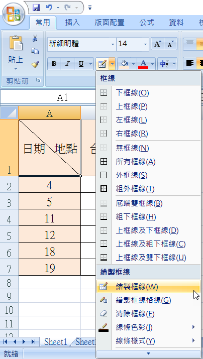 一般簡單的表頭,就像下圖一樣,可以用框線中的「繪製框線」在格子的對角拉一條線就好。
