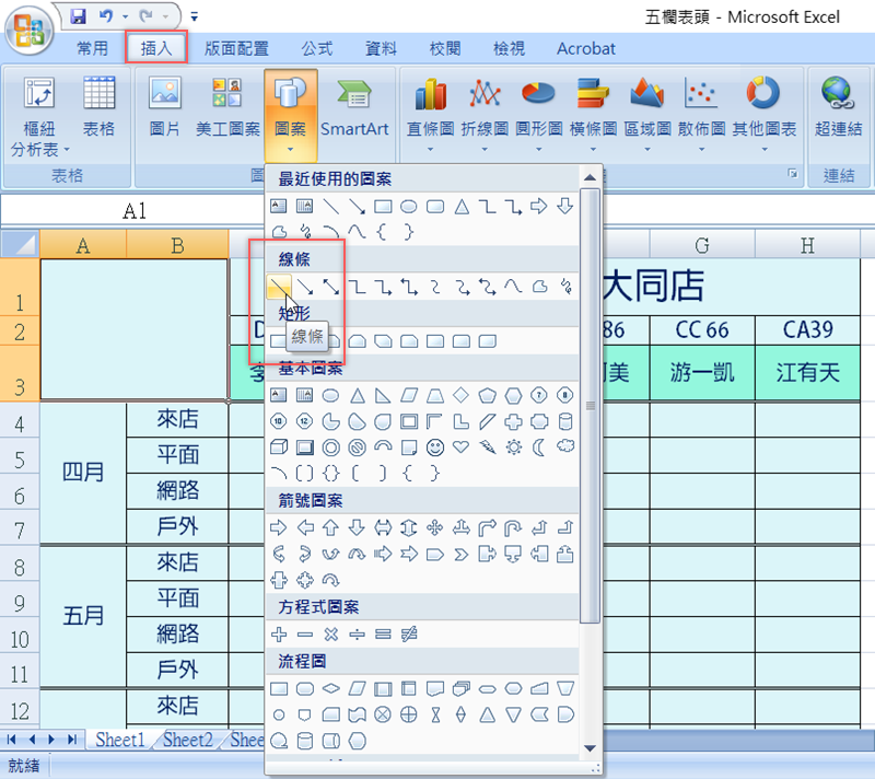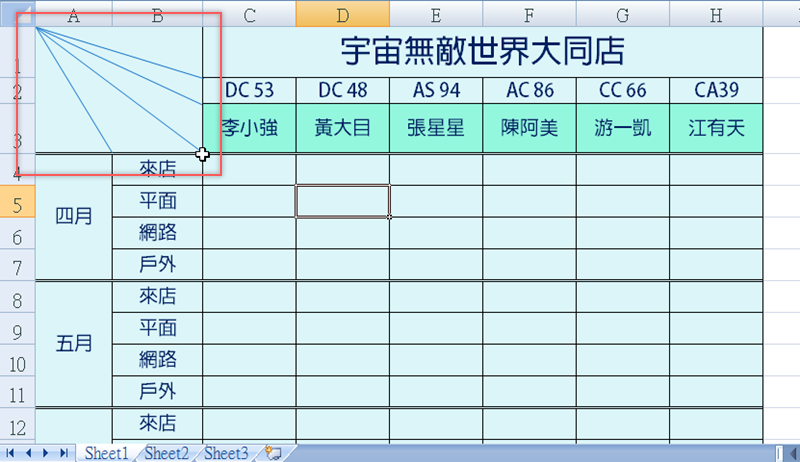 但遇到這種比較複雜的表格,表頭的斜線就要自己慢慢畫慢慢調整,接下來要畫一個五欄的表頭。