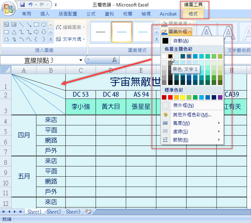 總共四條線畫完,接下來在繪圖工具中的格式,找到「圖案外框」來改變線條的顏色,就看你喜歡用什麼顏色吧。