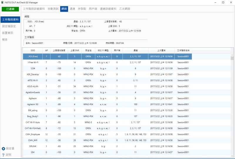 每個 SSID 點入後,可以更詳細的查看各種數據,像是 AP 數量、信號強度、頻帶使用以及佔用的通道、安全性、支援的 802.11 類型等,應有盡有。