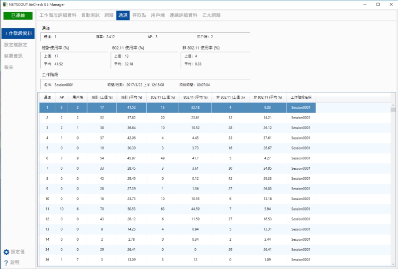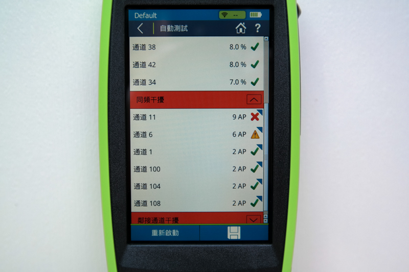 像是同頻段干擾是發生在哪些通道上等,這些都在測試儀上一目瞭然啊。