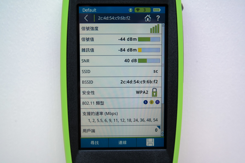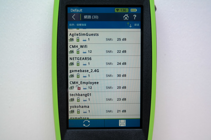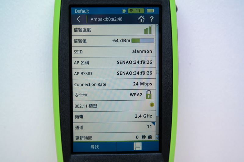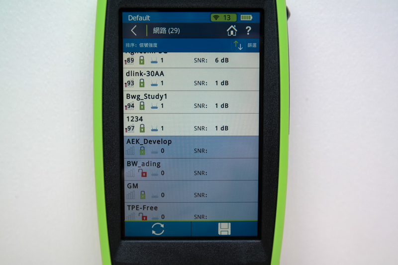 阿湯為了可以感受到這台測試儀的威力,也借了朋友的公司環境進行測試,一開機光看網路 SSID 就有 26 個,如果再細看的話,有些 SSID 更是包含 10 幾台 AP(就是利用漫遊進行延伸),從 AirCheck G2 最基本就能馬上查看所有 SSID 的 SNR(訊號雜訊比),還有每個 SSID 下共有幾台 AP,就能做初步的訊號源判斷。