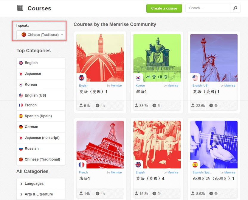 進到學習頁面之前需要註冊或用 FB、Google 登入,進來後先在左上角選擇自己的語言,然後就可以看到目前有的學習社群,並以學習的人數排序,像第一個美國腔的英語就有 51 K 的人學過。