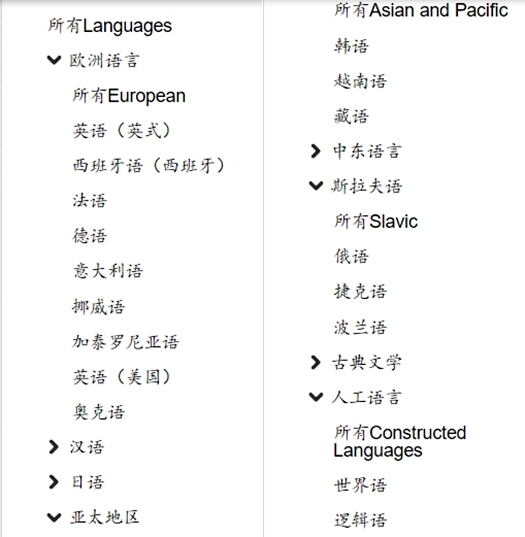 回到課程頁,在左排可以看到有哪些學習類別,在大分類底下還有一些小分類,分得很細,連人工語言都有。
