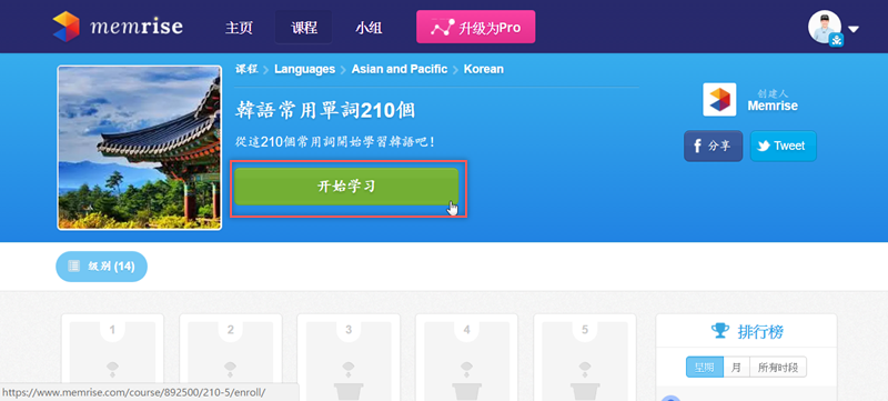 接下來就選一個課程來學習吧,阿湯選的是韓語常用單字 210 個,這是網站系統創建的課程,記得開喇叭才能邊聽邊學。